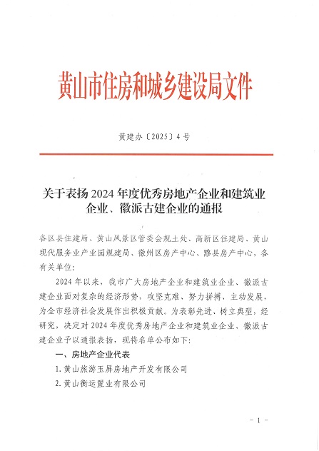 近日,黃山市住房和城鄉(xiāng)建設局發(fā)布了《關于表揚2024年度優(yōu)秀房地產企業(yè)和建筑業(yè)企業(yè)、徽派古建企業(yè)的通報》,黃山建工集團榮獲2024年度優(yōu)秀建筑業(yè)企業(yè)稱號。